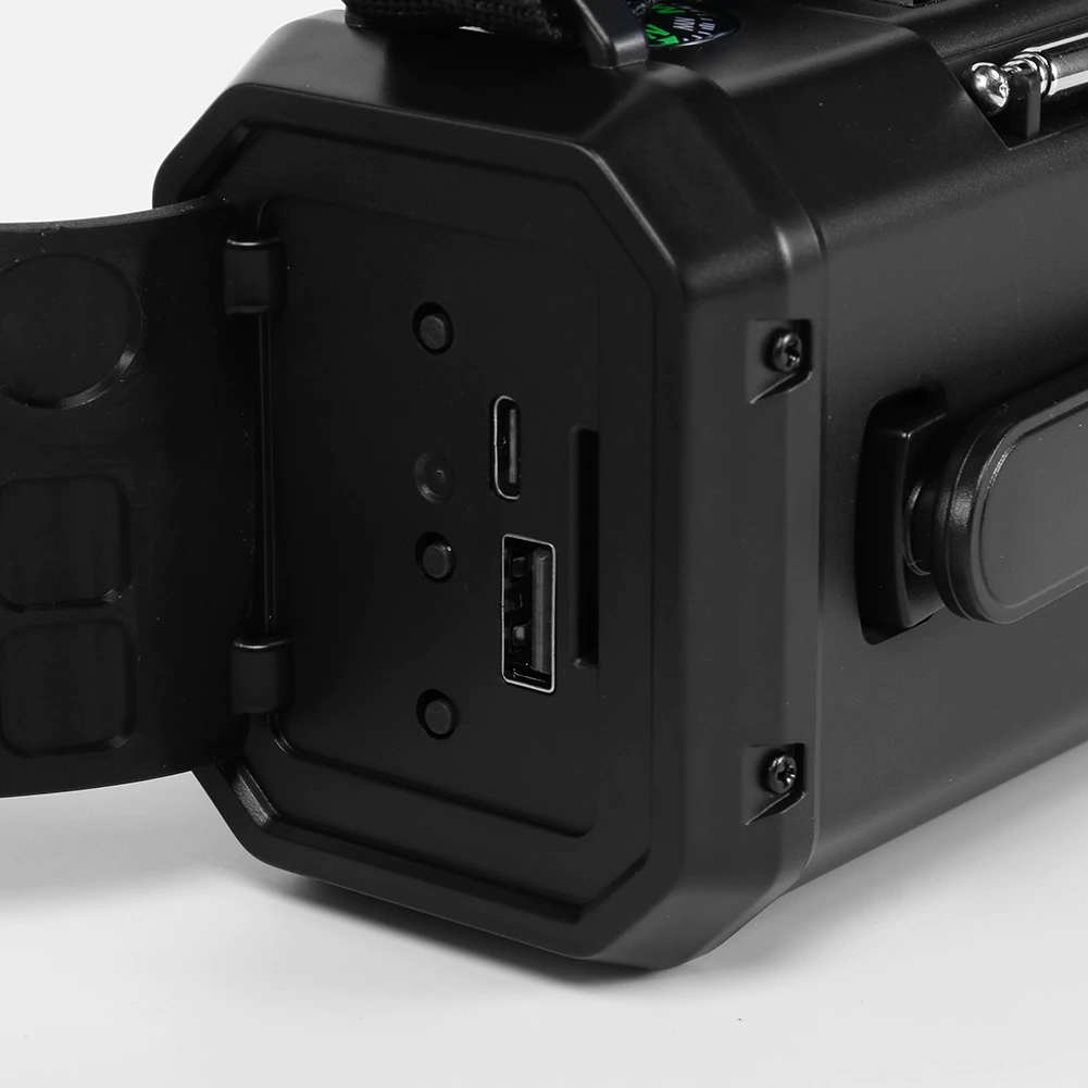 See vastupidav avariiraadio sisaldab sisseehitatud akupanka ja seda saab laadida käsigeneraatori, päikesepatarei või USB-pordi kaudu.