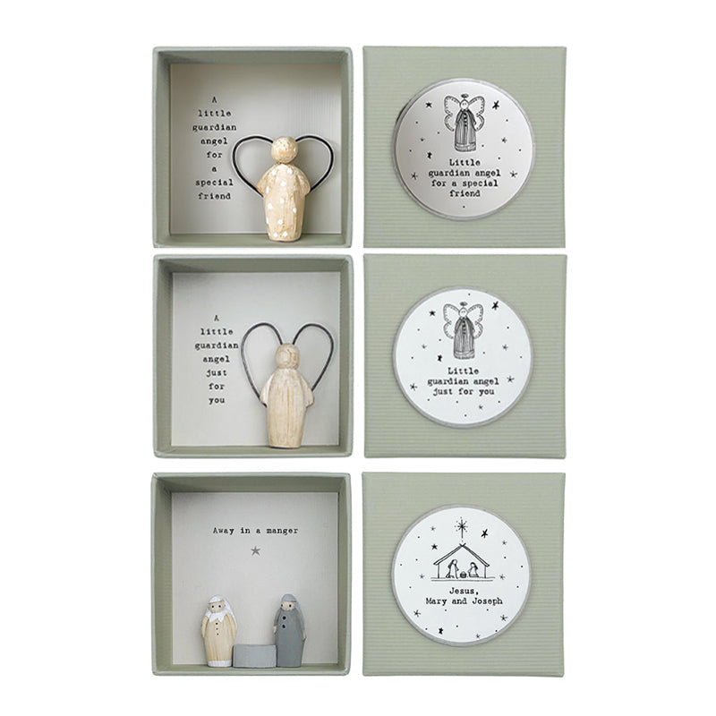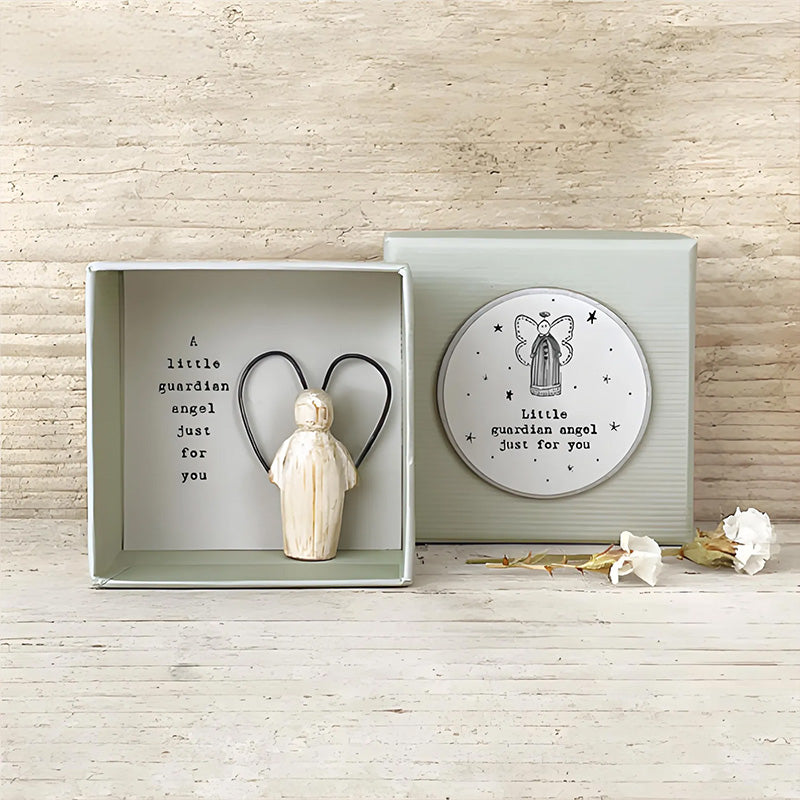 - Isiklik puudutus: Väike puidust ingli figuur elegantsete lõngast tiibadega ja tekstiga „Väike kaitseingel erilisele sõbrale“.