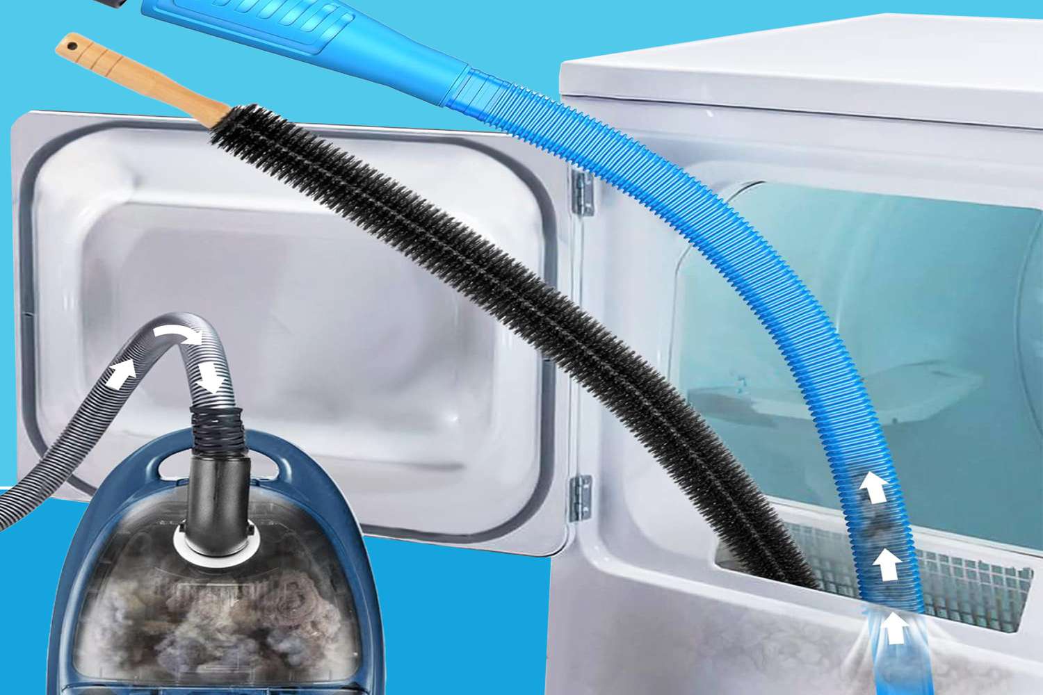 See puhastuskomplekt aitab hõlpsasti eemaldada aastaid kogunenud kiudude kogumid kuivati ventilatsiooniavast ja vähendada tulekahju ohtu.
