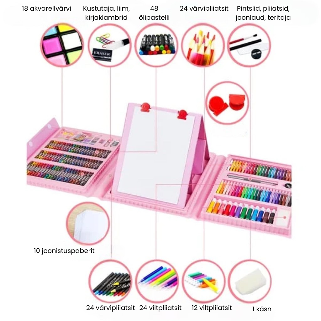🌸 Üllatage oma last selle muljetavaldava 208-osalise komplektiga mugavas kohvris. Komplektis on ka väljatõmmatav visandiplokk! Lapsed joonistavad ja loovad tunde kvaliteetsete ja vastupidavate vahenditega.