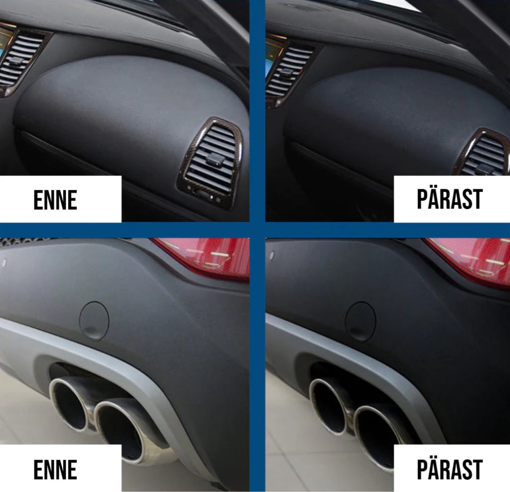 ► KAITSEB JA PEATAB LÄIGET, VANANEMIST, VÄRVIMUUTUSI. Meie autode plastmasside restaureerija mitte ainult ei lisa läiget mattidele plastpindadele ja istmepatjadele, vaid kaitseb ka uusi plastmassist detaile enneaegse vananemise ja tuhmumise eest, mida põhjustavad päikese UV-kiired ja maantee mustus!