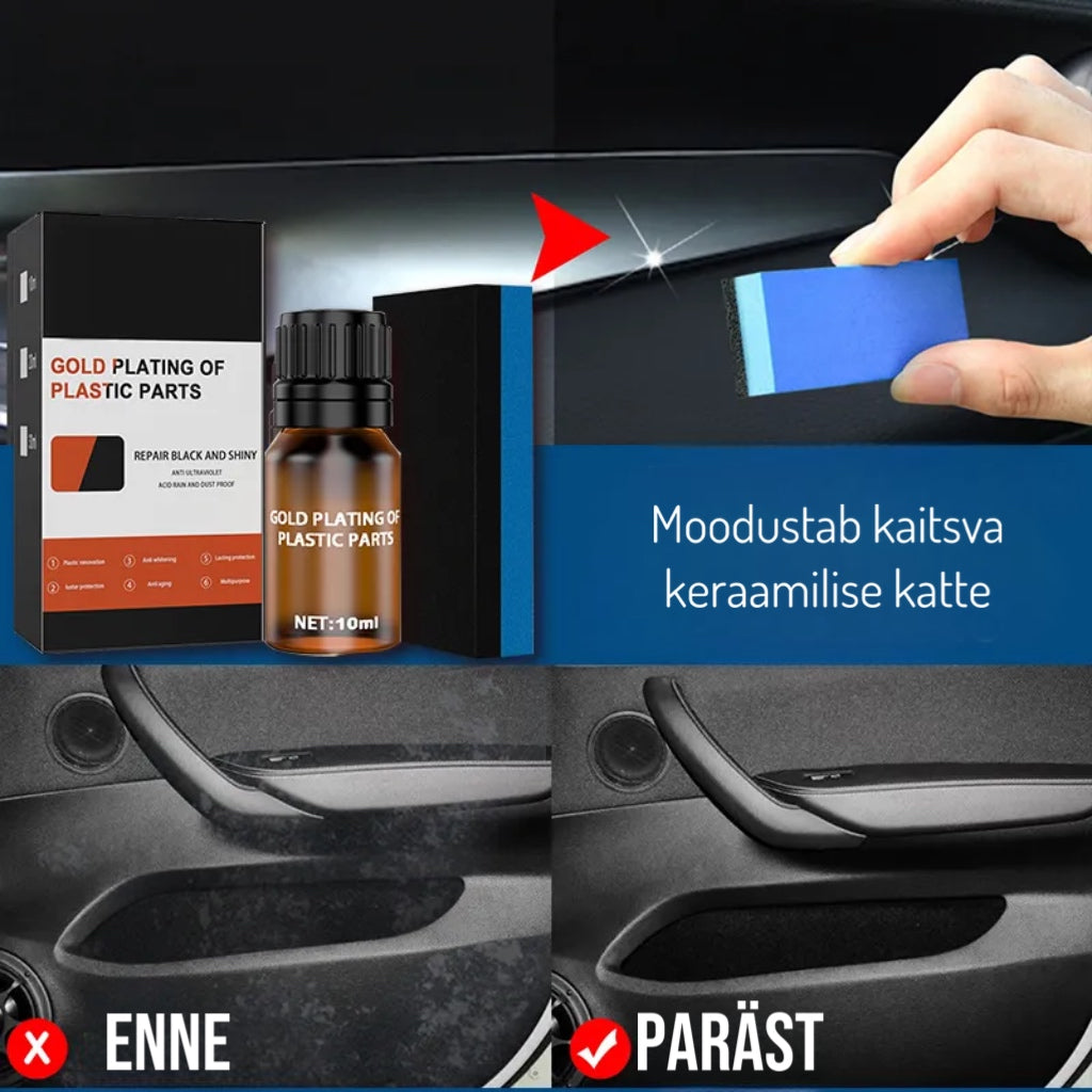 ► MUGAV KASUTAMINE Seda plastiku taastamisvahendit on lihtne kasutada! Lihtsalt pange mõned tilgad kaasasolevasse aplikaatorisse ja pühkige istmepolster või plastpinnad. Te märkate erinevust juba pärast ühte kasutamist! Seda on väga lihtne kasutada ja teie polster näeb välja nagu uus!