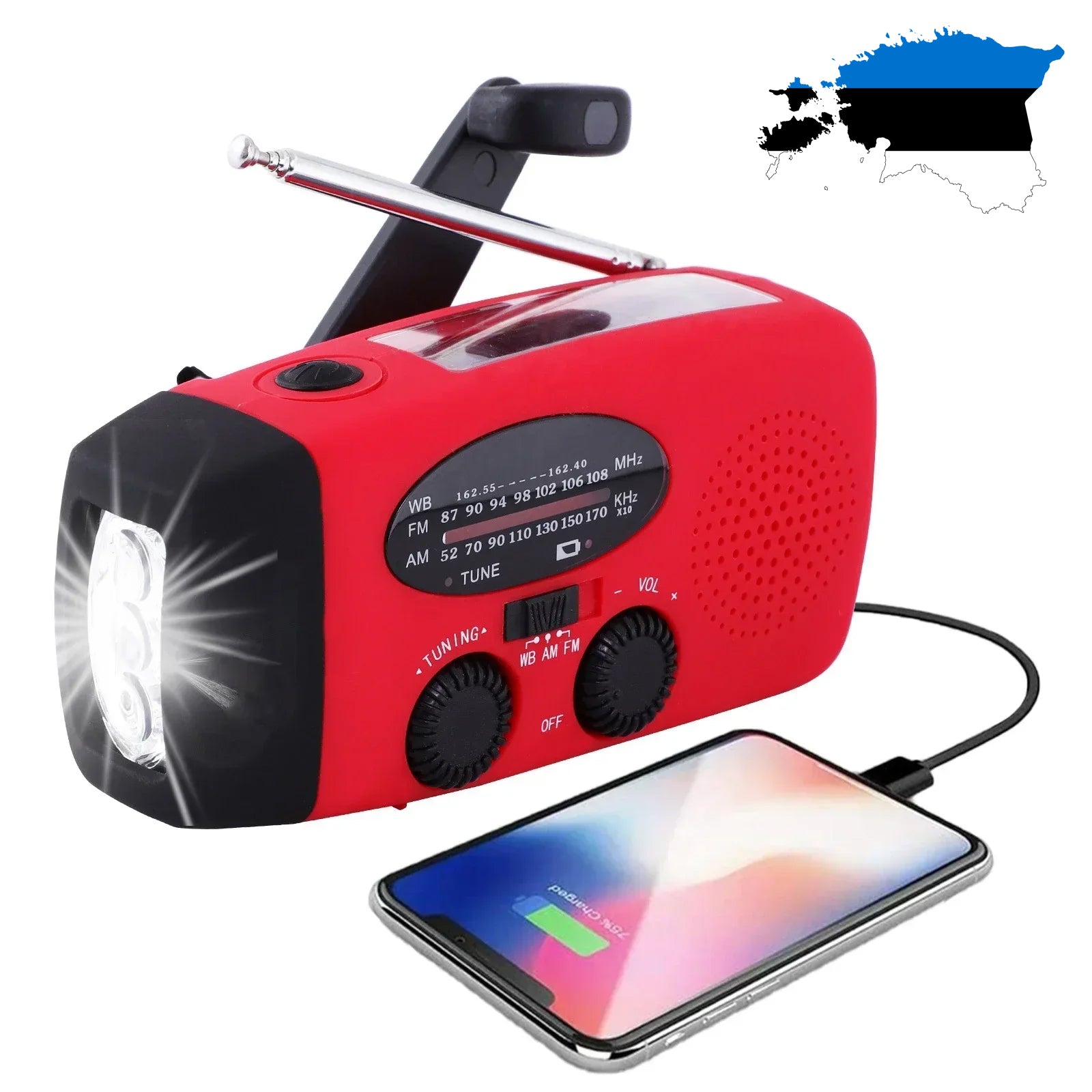 - Raadiot saab laadida USB kaudu, päikesepaneeli või käsigeneraatori abil, et teil oleks alati juurdepääs hädaabi sidele ja valgustusele. Kerge ja kompaktne, see mahub kergesti seljakotti või saab kanda lisatud nööri abil.