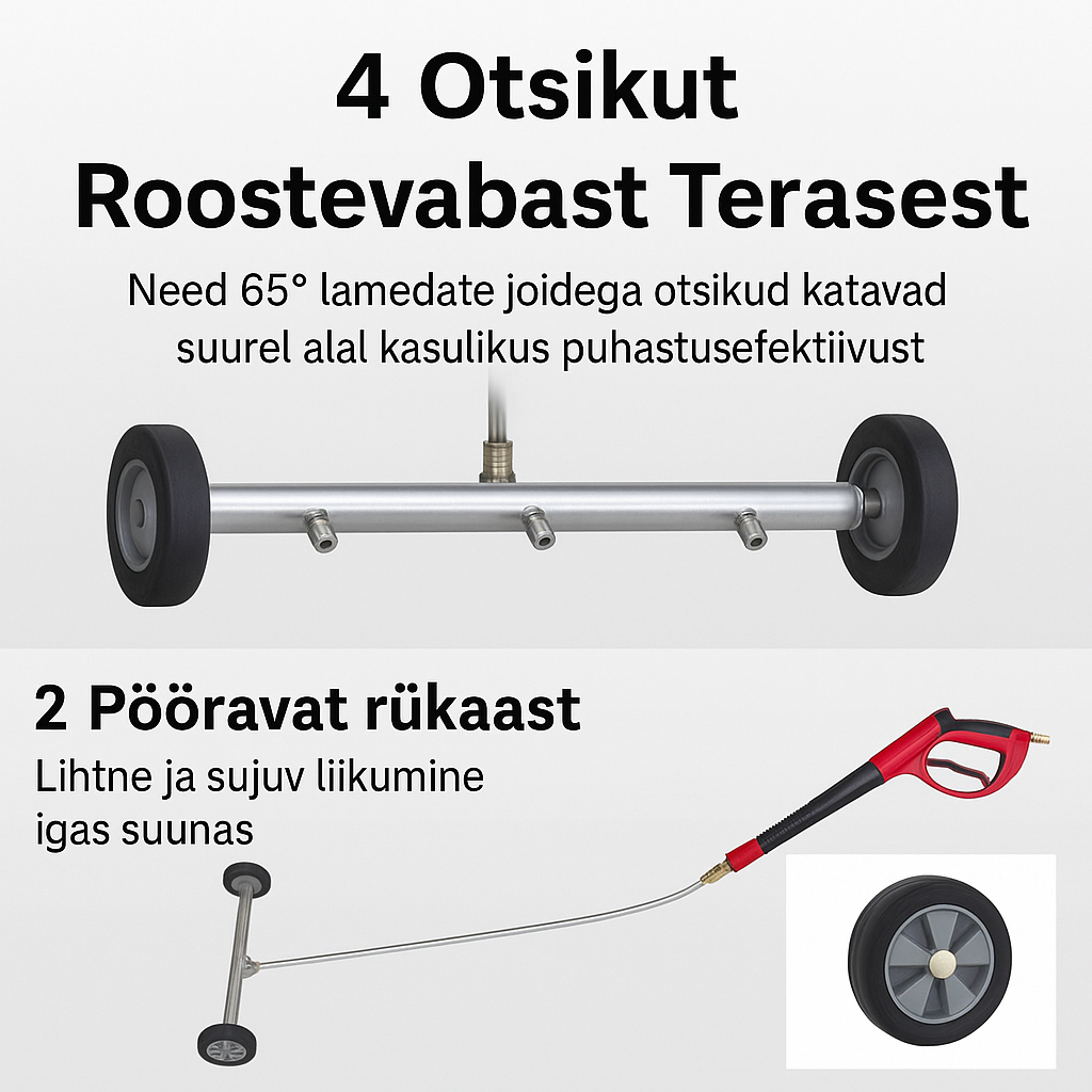 UnderWash on võimas põhja puhastamise tööriist, mis on mõeldud kasutamiseks survepesuritega. Valmistatud roostevabast terasest, vasest ja alumiiniumisulamist – see tagab kuni 4000 PSI puhastusvõimsust. Ideaalne auto, maasturi või veoauto põhja alt soola, mustuse ja teeosakeste eemaldamiseks.